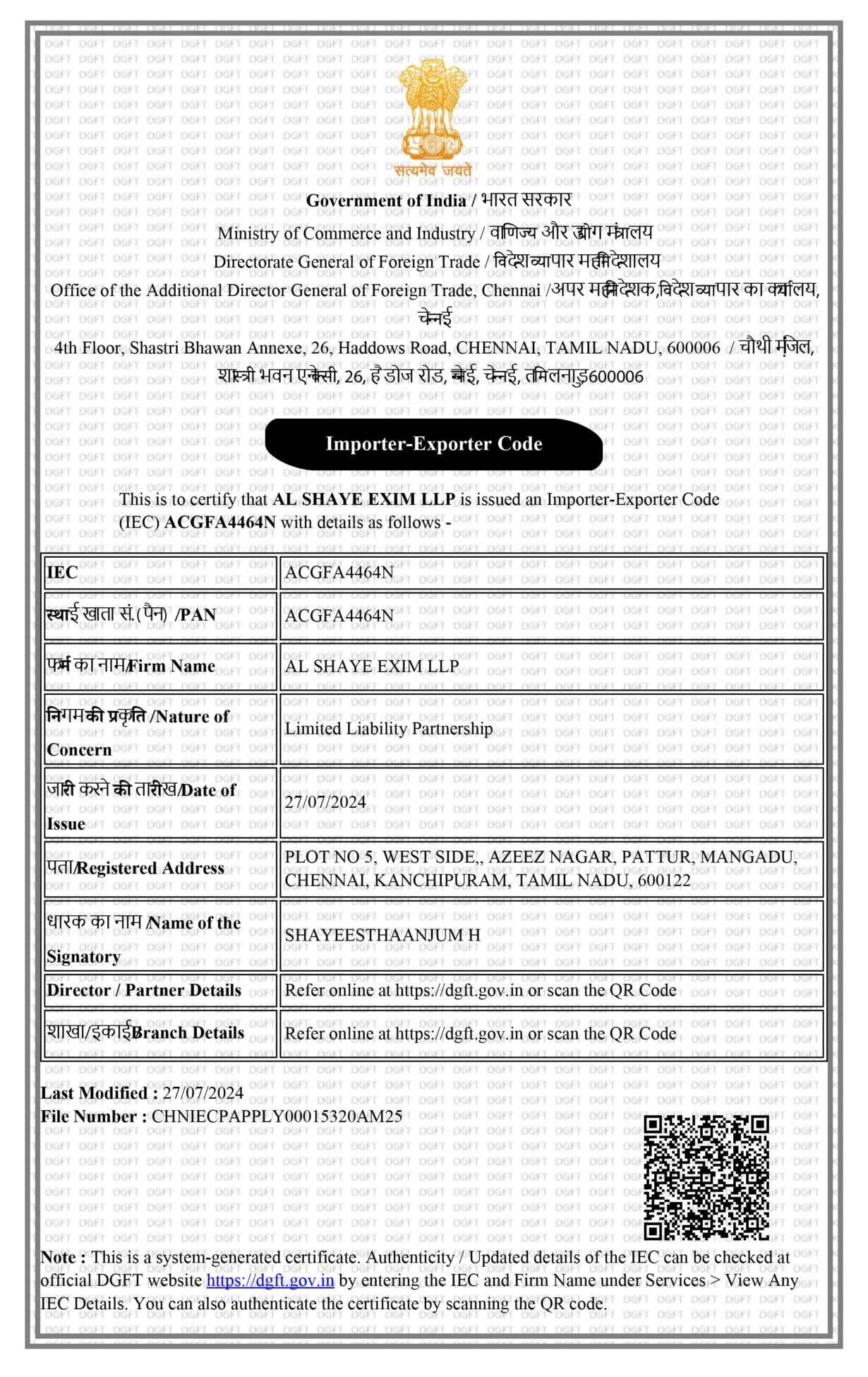 Importer Exporter Certificate